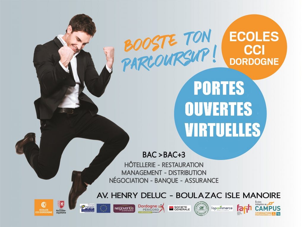 Boostez votre PARCOURSUP ! L’orientation post-bac se profile et les Écoles de la CCI Dordogne organisent des rencontres en ligne pour préparer votre projet de formation. Inscrivez-vous aux JPO virtuelles par filière d’études et rencontrez nos équipes pédagogiques et étudiants. Inscription indispensable > https://www.ecoleccidordogne.cci-dordogne.com/participation-portes-ouvertes/ pour recevoir un code d’accès.